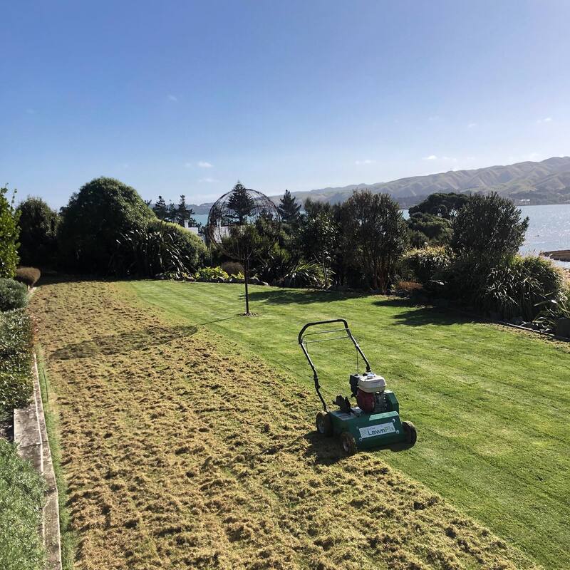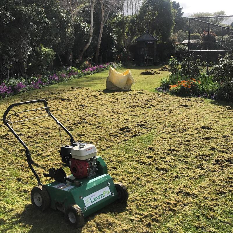 Dethatching is am important part of lawn care, below you'll see a lawn before dethatching, during and 6 weeks after the dethatching.
